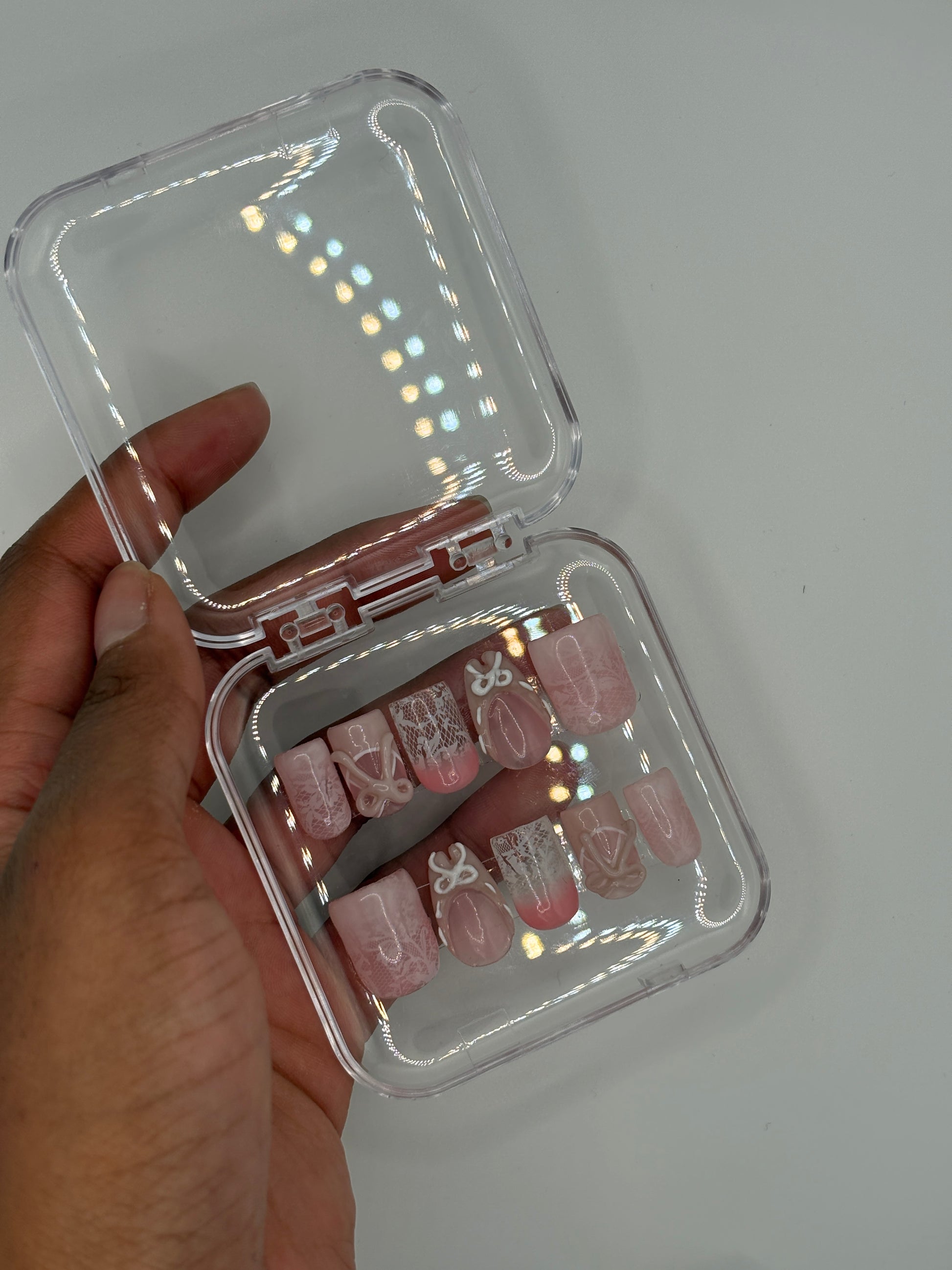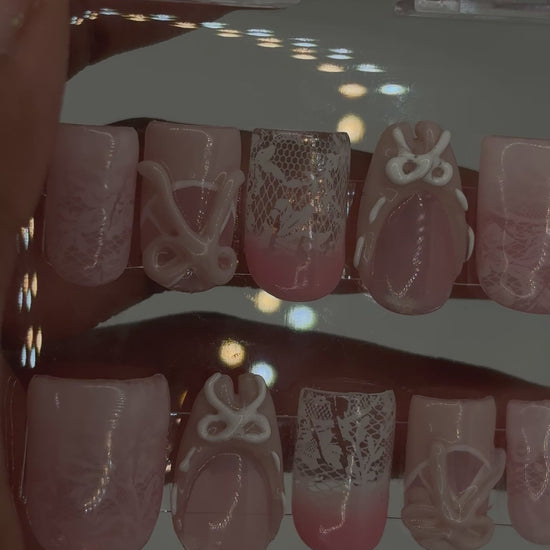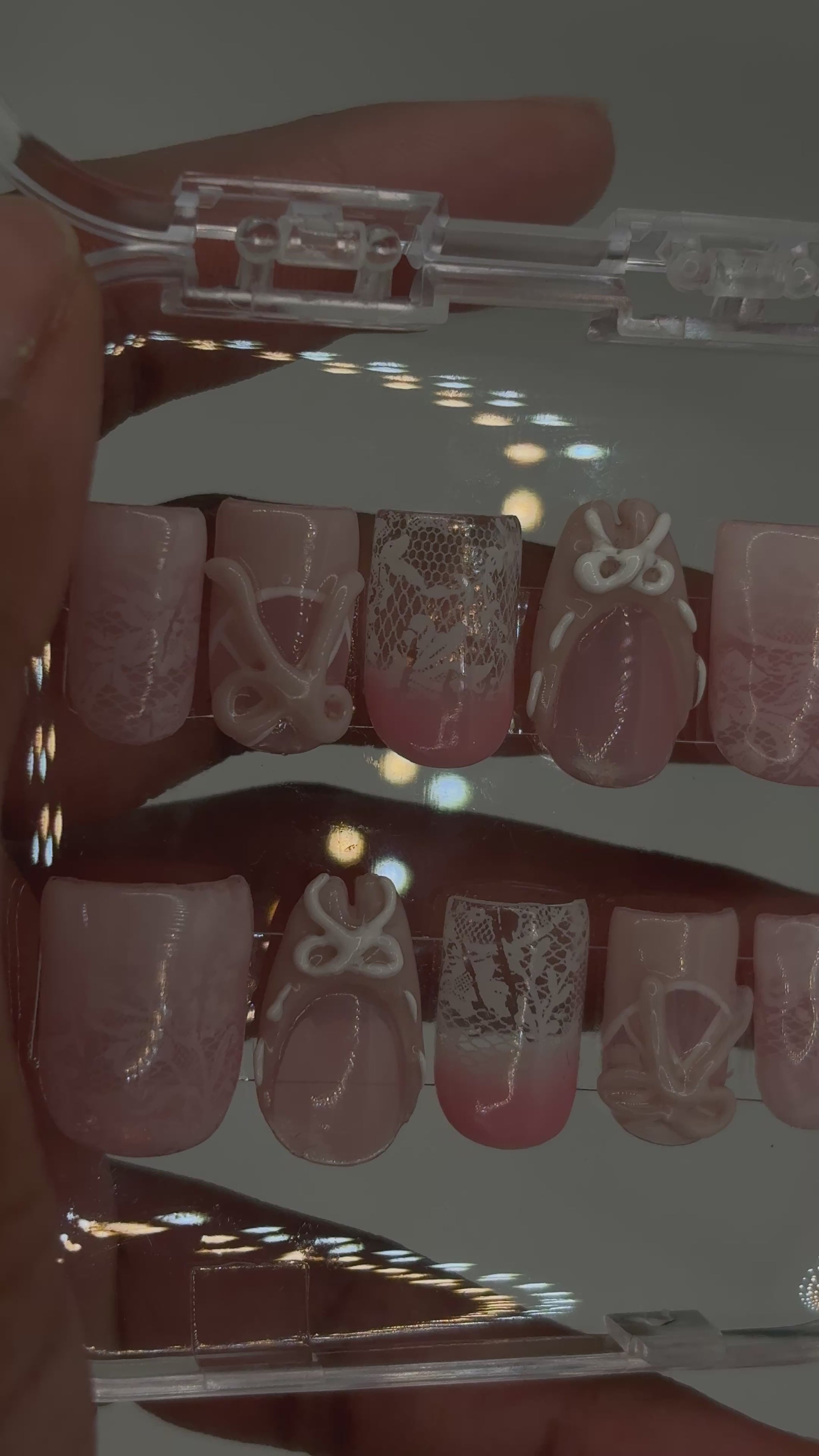 Lacy pink set, heavily inspired by ballet. This set is mainly square; however, the index finger is almond. This set is short and will only be offered in custom sizing.